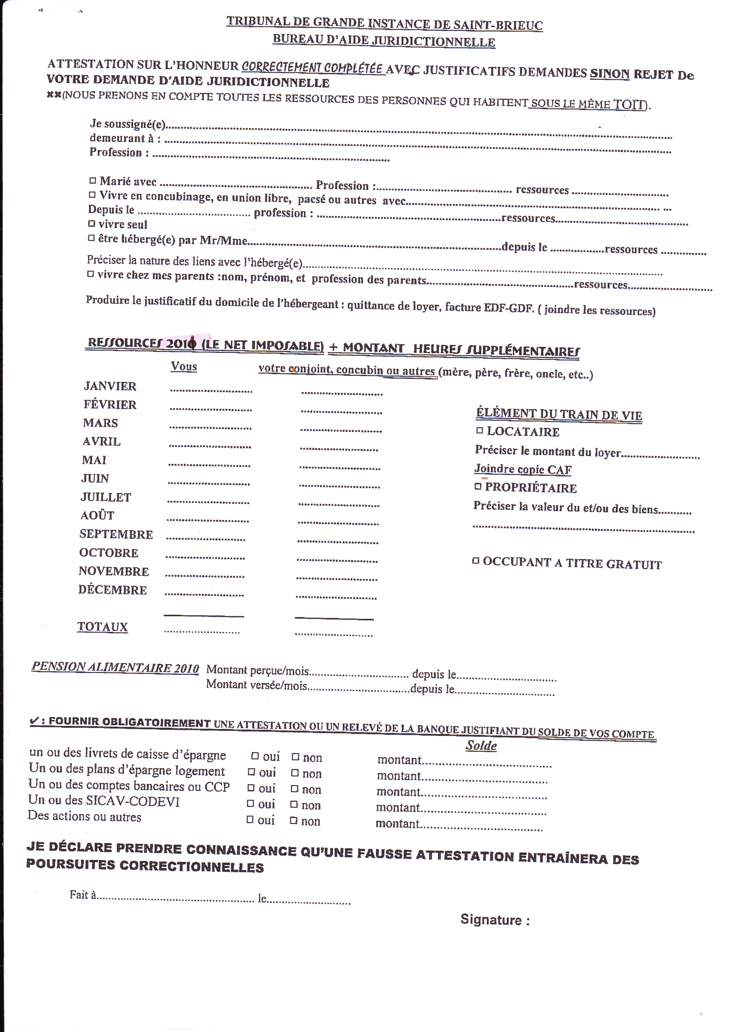 Si vous rentrez dans le cadre de l’aide juridictionnelle vous pouvez télécharger le dossier sur Service-Public.fr Cerfa N° : 12467*01 et l’attestation sur l’honneur à joindre obligatoirement au dossier d’aide juridictionnelle au bas de cette page.